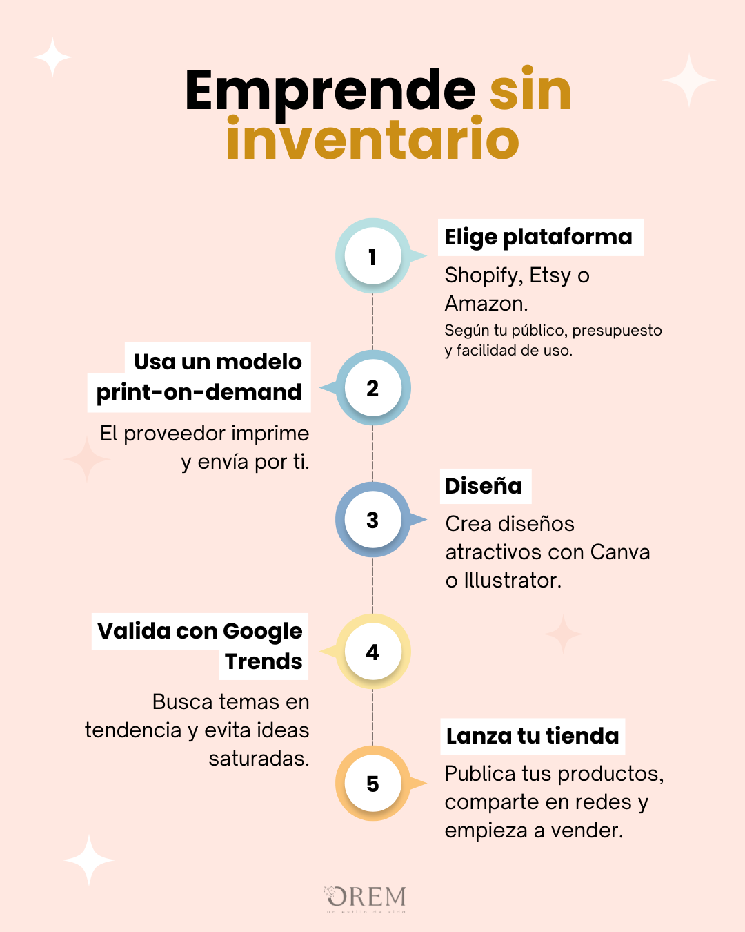 Gracias al modelo de print-on-demand o dropshipping, puedes vender desde planners hasta termos sin invertir miles de pesos en inventario.