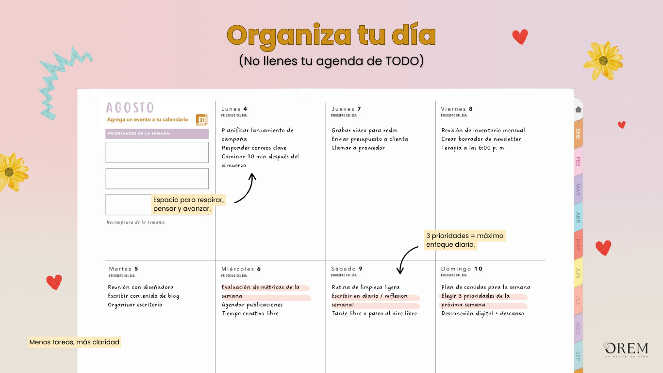 Otra clave de oro para quienes se preguntan cómo tener más energía durante el día es tener un plan. No el de hacer mil cosas, sino uno realista. Una mente caótica = cuerpo cansado.